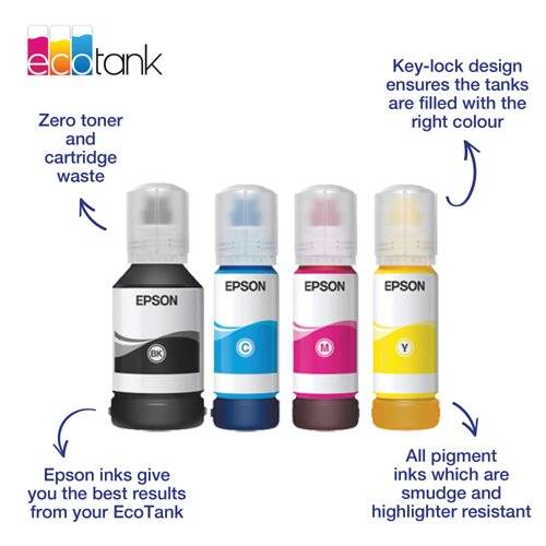 - Enjoy great prints with clear text and vivid colours with this reliable and high-quality ink. The 113 ink series features all pigment inks to give you sharp prints that resist smudges and highlighters. As the pigment is quick drying, this ink is ideal for producing double-sided prints. Filling EcoTank is simple and mess free with the resealable, intuitive and drip-free ink bottles. Thanks to a special mechanism, these ink bottles only allow the correct colours to be inserted.