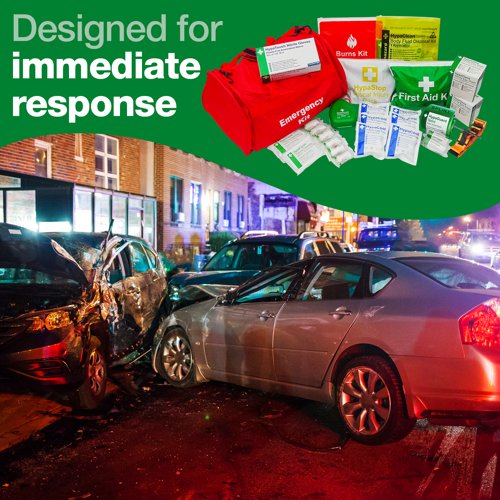 | Includes emergency supplies like a tourniquet, haemostatic gauze, trauma dressings, a burns kit, a British Standard first aid kit and a body fluid disposal kit |
