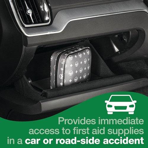- Safety First Aid Group's Car and Travel First Aid Kit is the ideal first aid kit for cars, providing immediate access to essential first aid supplies in emergency situations. Included in the first aid kit are sterile moist wipes, sterile dressings, microporous tape, burn dressing, a foil blanket, gloves, eyewash solution and more. This vehicle first aid kit comes in a reusable, zippered case designed to keep medical supplies neatly organised and well-protected. Inside, two secure mesh pockets help prevent items from shifting, making everything easy to find in an emergency. The case features a dark grey, water-resistant exterior with light grey decals of a first aid cross and a steering wheel, ensuring it's instantly recognisable as a motoring first aid kit. Built from tough, easy-to-clean materials, the case is designed to withstand the rough-and-tumble environment of your glove compartment, boot, or toolbox. A removable cardboard sleeve wraps the kit and includes a detailed list of contents on the back so that users know exactly what's included when every second counts.