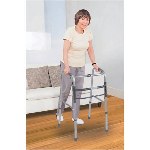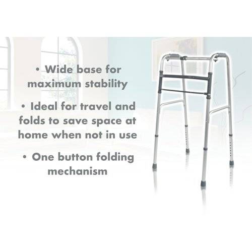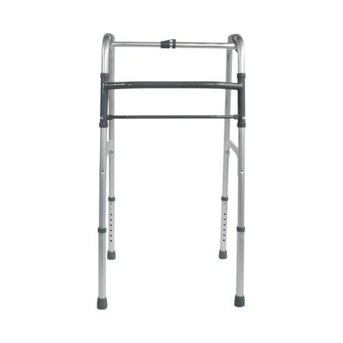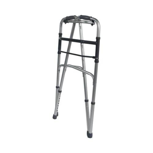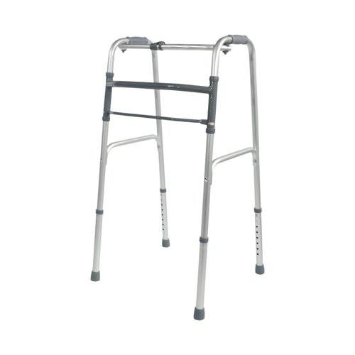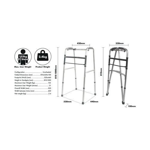 - Lightweight Aluminium Folding Walking Frame with a wide base for maximum stability, ideal for home use. The lightweight aluminium walking frame features soft grip handles, one button folding function and height adjustable legs. This frame can be folded when not in use and is a real space saver. Ideal for travel use. Maximum User Weight Limit 133kg (21 stone). Supplied without wheels.
