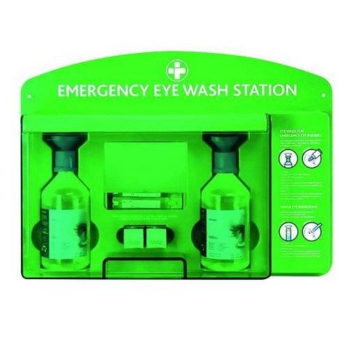 - This premium Reliance Medical Emergency Eye Wash Station is made from durable wipe clean ABS plastic and comes complete with 2 x eye pad dressings 2 x 500ml bottles of eye wash and 5 x 20ml eye wash pods. The comprehensive eye wash station also includes an integral eye bath and mirror for easy application. With a heavy duty dust proof cover and illuminated printed instructions.