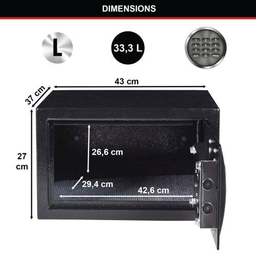 This laptop safe is designed to secure laptops, tablets and other electronic devices. The electronic lock with key override provides additional security and the safe also features access for power cords, so you can charge your laptop whilst in the safe. This safe can also be fixed to the floor with the included hardware. This 34 litre safe measures W430 x D370 x H270mm.