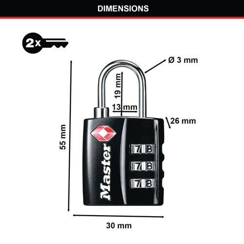 - Ideal for travel, this Master Lock Combination Padlock features a 3-digit resettable combination for enhanced security. TSA accepted for travel to the United States, the padlock has a strong 32mm wide steel shackle and robust black metal body for heavy duty, long lasting use.