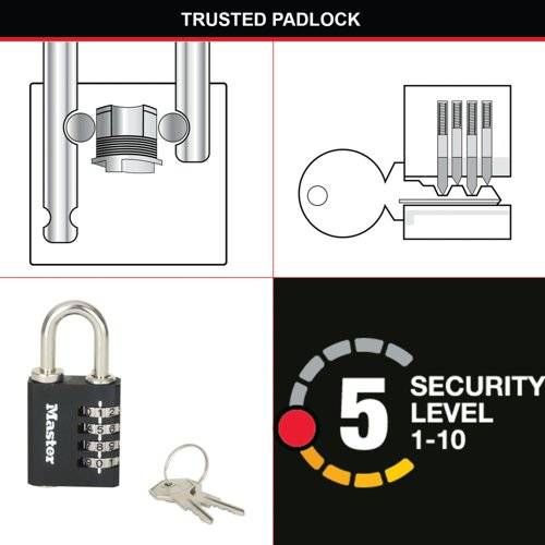 - The Master Lock No. 7641EURD Set-Your-Own Combination Padlock with override key features a 40mm wide zinc body for durability with a black finish. For indoor use, ideal to secure cabinets, lockers, gates, fences and more. The 6mm diameter shackle is 28mm long and made of steel, offering resistance to cutting and sawing. The 4 dial combination security offers more than 10000 possible combinations. Never get locked out thanks to the override key for backup access. The Limited Lifetime Warranty provides peace of mind from a brand you can trust.