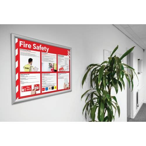 - The Fire Safety sign is a standard workplace safety sign designed for high visibility. Displaying the six steps to take: Minimise the potential, Minimise dangers to staff, Maintenance of fire precautions, Fire actions, Fire extinguishers, and Contacting the emergency services. This A2 poster provides clear guidelines for fire safety in the workplace.