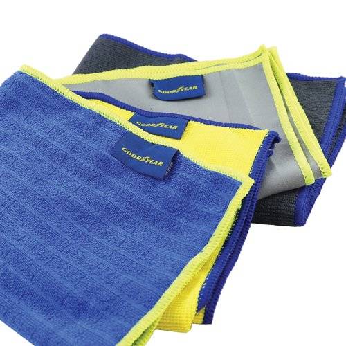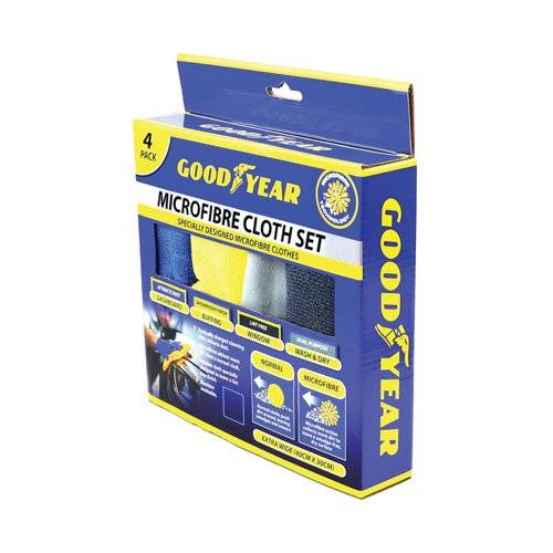 - The Goodyear Microfibre Cloth Set is specially designed for superior vehicle cleaning, featuring statically charged cleaning fibres that attract and hold dust and dirt more effectively than traditional cloths. Each cloth in this 4-piece set - Dashboard Cloth, Buffing Cloth, Window Cloth, and Wash and Dry Cloth - is tailored for specific cleaning tasks, ensuring a showroom finish every time. The advanced microfibre technology used in these cloths provides a high level of dirt attraction and absorption, making them ideal for achieving a spotless, streak-free look on your vehicle. The Dashboard Cloth gently cleans interior surfaces without scratching, while the Buffing Cloth is perfect for polishing and adding a high gloss. The Window Cloth ensures a clear, streak-free shine on glass surfaces, and the Wash and Dry Cloth is versatile for various cleaning and drying tasks. All cloths are machine washable, retaining their effectiveness and durability even after repeated use. This set combines convenience with professional-grade results, making it an essential addition to your vehicle care routine. Designed for hassle-free use, these microfibre cloths are easy to care for. They are quick-drying and retain their shape and cleaning properties after each wash, making them a reliable and practical choice for regular vehicle maintenance