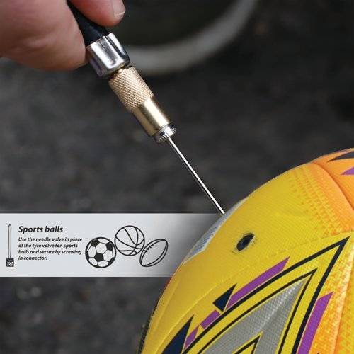 - The Goodyear Compact Air Compressor is ideal for the rapid inflation of tyres, sporting and camping equipment. Complete with three nozzles, this lightweight and compact design has a secure valve attachment with a nylon air hose with quick release chuck. Powered by a 12V power cable and measuring up to 250 PSI, the air compressor has a three metre cord.