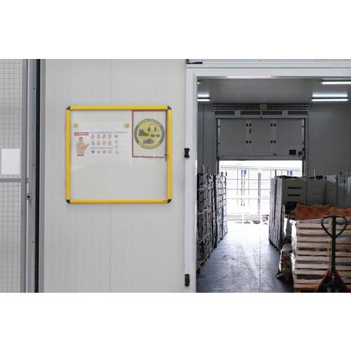 - Bi-Office Ultrabrite lockable display cases have a highly visible aluminium yellow frame, ideal for an industrial environment to display and highlight important information or safety instructions, as well as keep the documents saved from dust or water splashes. The magnetic lacquered steel surface means that you can attach your notices with a simple magnet and when you remove it, its as good as new. its lockable, strong, and lightweight solution. There is clear visibility of the displayed items due to the swinging acrylic door, which can be locked to protect the inside materials from hampering, manipulation, or the weather. This lockable board comes with 2 keys, so you can keep a key in a safe location, to use as a spare if the other one gets lost. The set also includes a wall mount kit for easy installation.