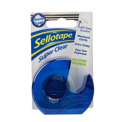 - This handy Sellotape tape dispenser makes it easy to use tape, eliminating the need to use scissors and making it ideal for fuss-free wrapping. Complete with a roll of 18mm Sellotape Super Clear which is a high clarity tape, ensuring a crystal clear finish. The tape is suitable for sticking card, paper, envelopes and more. This pack contains 6 dispensers each containing one roll of 18mm wide and 15m long Sellotape.