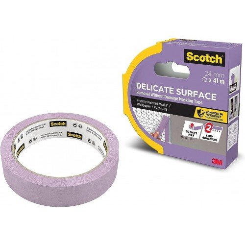 Scotch® Delicate Surface Advanced Masking Tape has low tack adhesion and is specially designed for delicate indoor surfaces such as wood floors furniture wallpaper and freshly painted walls (painted at least 24 hours ago). 3M advanced technology provides super sharp lines for perfect results. With high adhesive quality and very high UV resistance this tape removes easily without residue up to 60 days after application.