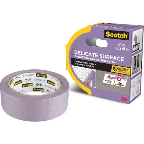 Scotch® Delicate Surface Advanced Masking Tape has low tack adhesion and is specially designed for delicate indoor surfaces such as wood floors furniture wallpaper and freshly painted walls (painted at least 24 hours ago). 3M advanced technology provides super sharp lines for perfect results. With high adhesive quality and very high UV resistance this tape removes easily without residue up to 60 days after application.