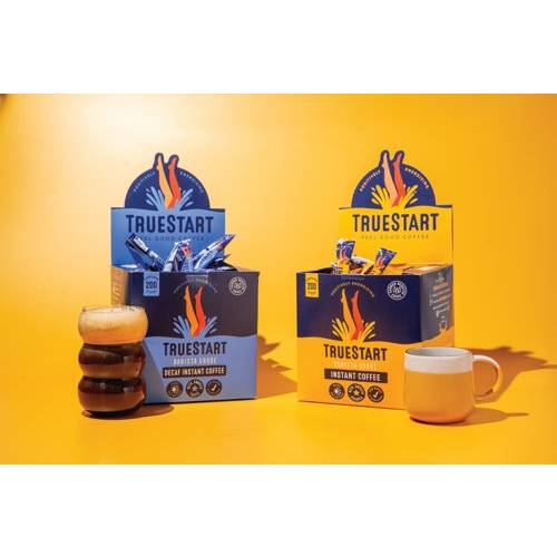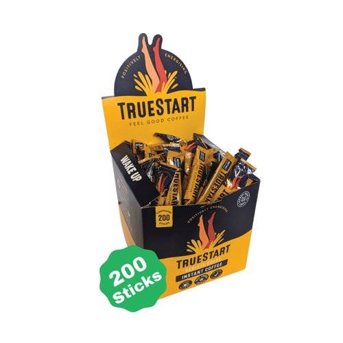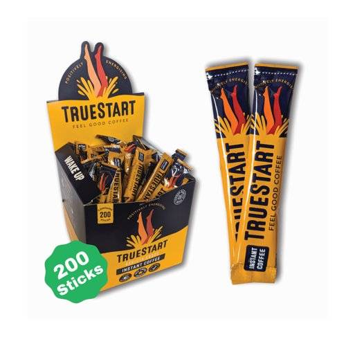 - TrueStart instant coffee is made with speciality grade, 100% Colombian arabica beans, giving an exceptional taste that is rich and smooth. Certified Carbon Negative and B Corp Certified, the coffee has outstanding ethics. Optimised to make you feel amazing, this Barista Grade instant coffee is Lab tested to check that it is mycotoxin free, full of antioxidants and contains a regulated caffeine content. Supplied in a pack of 200 2g individual sticks, ideal for convenience and portability.