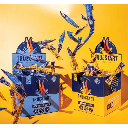 - TrueStart instant coffee is made with speciality grade, 100% Colombian arabica beans, giving an exceptional taste that is rich and smooth. Certified Carbon Negative and B Corp Certified, the coffee has outstanding ethics. Optimised to make you feel amazing, this Barista Grade Decaf instant coffee is Lab tested to check that it is mycotoxin free, full of antioxidants and chemicals are not used in the decaffeination process, preventing a metallic after-taste. Supplied in a pack of 200 2g individual sticks, ideal for convenience and portability.