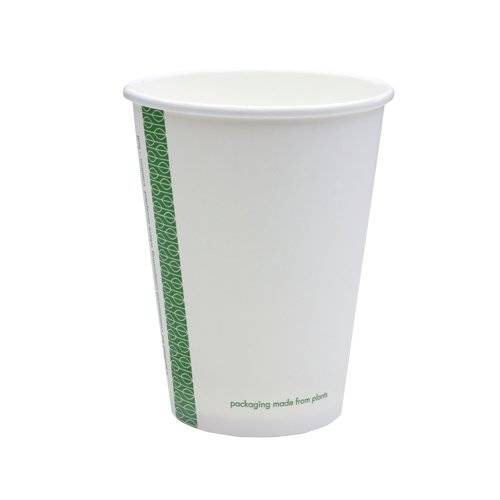 Eco single wall hot cup. Fits Vegware's 89-Series lids. For coffee tea and all hot drinks or soup to go. Also ideal portion control for chips or fried treats. Sustainable board with a plant-based PLA lining. Crisp white with Vegware messaging in green. Award-winning quality by Vegware made from plants. Commercially compostable where accepted.
