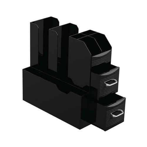 This 'All in one' design is a compact unit which holds coffee accessories. Featuring ten compartments, suitable for storing cup lids, spoons, stirrers, napkins, sugars and creamers. Supplied in black.