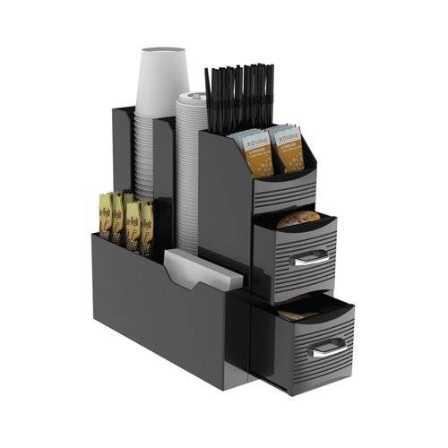 - This 'All in one' design is a compact unit which holds coffee accessories. Featuring ten compartments, suitable for storing cup lids, spoons, stirrers, napkins, sugars and creamers. Supplied in black.