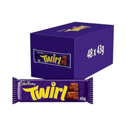 - A divinely indulgent snack to help get you through the day these Cadbury Twirl chocolate bars are a delightfully curly milk chocolate finger coated in mouth-wateringly delicious Cadbury milk chocolate. These wonderful chocolate bars are suitable for vegetarians and are supplied in a pack of 48.