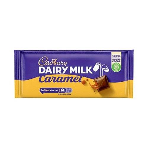 - Cadbury Dairy Milk chocolate bar with a soft caramel centre. Made with sustainably sourced cocoa. Suitable for Vegetarians. 120g bar.