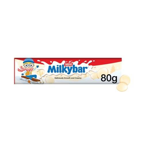 - Nestle's deliciously creamy, Milkybar white chocolate buttons make a delicious sweet gift for children. Free from artificial flavours, colours and preservatives, this giant chocolate tube is a gift you can feel happy to give. Supplied in an 80g tube.