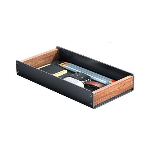 With a touch of design and modernity, combining walnut wood and black aluminium, the Alba desktop tray gives a new aesthetic dimension with a mix of colour and materials to transform workplaces with style and elegance. Keeping desktop essentials at hand, whilst still contained to avoid small items such as pens and pencils from rolling away.