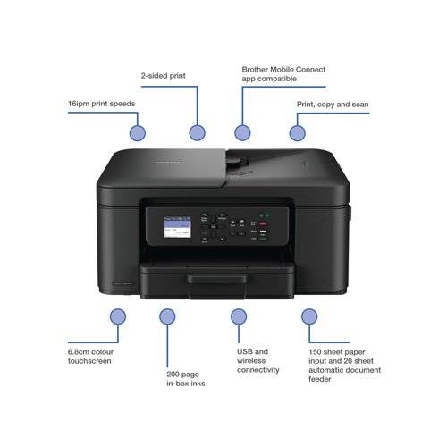 Stay connected and print effortlessly from anywhere with the compact and versatile DCP-J1460DW. Featuring an intuitive touchscreen for easy navigation and an automatic document feeder for added convenience. Easily print, scan and copy from one device. Wireless connectivity makes it easy for everyone in your household to print from their laptop or mobile device.