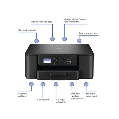 With its compact design and versatile functionality, the DCP-J1310DW makes printing effortless. Easily print, scan and copy from one device and navigate using the built-in colour display. Wireless connectivity allows everyone in your household to print easily from their laptop or mobile device.