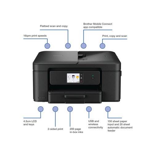 Experience seamless printing from anywhere with the compact and flexible DCP-J1360DW, equipped with a colour display and an automatic document feeder for added convenience. Easily print, scan and copy from one device. Wireless connectivity makes it easier for everyone in your household to print from their laptop or mobile device.