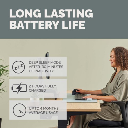 The rechargeable battery lasts up to 4 months on a single charge and powers up in just 2 hours. Its plastic housing and buttons are crafted with 100% post-consumer recycled plastic.