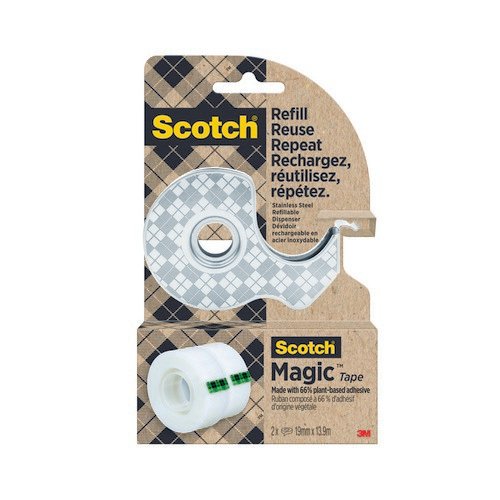 | Scotch® Magic™ tape made with 66% plant based adhesive refill rolls are compatible with Scotch™ desktop dispensers for easy use, and can also be used alone |
