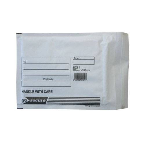 - Lightweight and economical, these GoSecure bubble lined envelopes are designed to be impact resistant. With a bubble lined interior and an exterior made from 75gsm MG grade paper, these envelopes are ideal for protecting delicate or fragile items in transit. Featuring a sender address box and a secure peel and seal closure, these size 4 white envelopes measure 170 x 245mm (internal size) and come in a pack of 100. The bubble that inner lines the mailers is produced using a minimum of 30% recycled content.