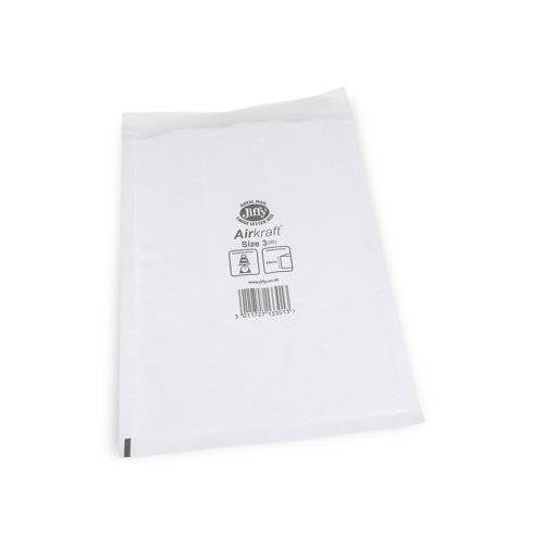 - Save on postage costs with this lightweight bubble lined Jiffy Airkraft mailer. The lining is designed to be puncture and shock resistant to protect delicate or fragile items in transit. The mailer also features a strong simple self-seal closure. These size 3 white mailers measure 220 x 320mm. This pack contains 100 white mailers. The bubble that inner lines the mailers is produced using a minimum of 30% recycled content.