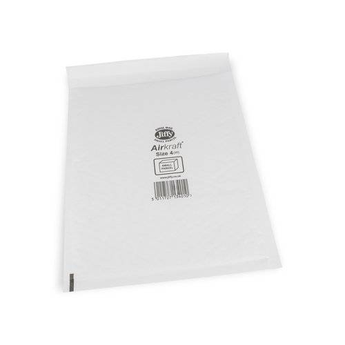 - Save on postage costs with this lightweight bubble lined Jiffy Airkraft mailer. The lining is designed to be puncture and shock resistant to protect delicate or fragile items in transit. The mailer also features a strong simple self-seal closure. These size 4 white mailers measure 240 x 320mm. This pack contains 100 white mailers. The bubble that inner lines the mailers is produced using a minimum of 30% recycled content.