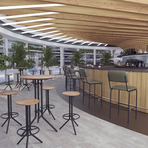 The Tovi High Chair combines a contemporary bistro style with durability, featuring a sturdy black steel frame, foot base, padded seat and back for comfort. Its versatile design makes it well-suited to cafs, dining areas, and hospitality environments, offering both style and practicality across a range of settings.