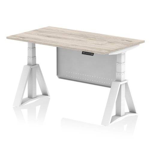 Air Modesty 1400 x 800mm Height Adjustable Office Desk Grey Oak Top White Leg With White Steel Modesty Panel with Piste Foot