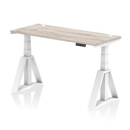 Air 1400 x 600mm Height Adjustable Office Desk Grey Oak Top Cable Ports White Leg with Piste Foot