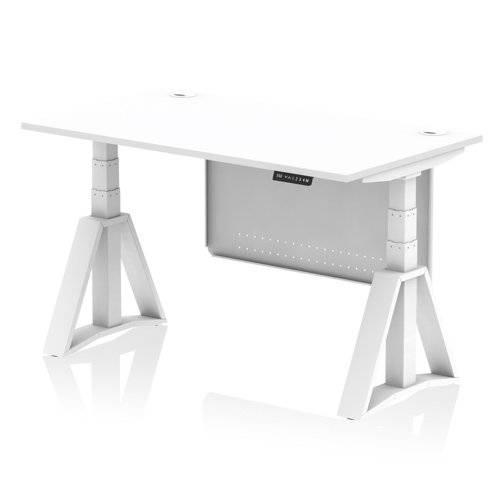 Air Modesty 1400 x 800mm Height Adjustable Office Desk White Top Cable Ports White Leg With White Steel Modesty Panel with Piste Foot