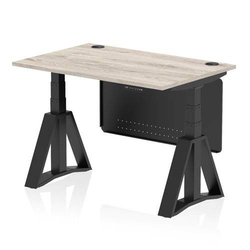 Air Modesty 1200 x 800mm Height Adjustable Office Desk Grey Oak Top Cable Ports Black Leg With Black Steel Modesty Panel with Piste Foot
