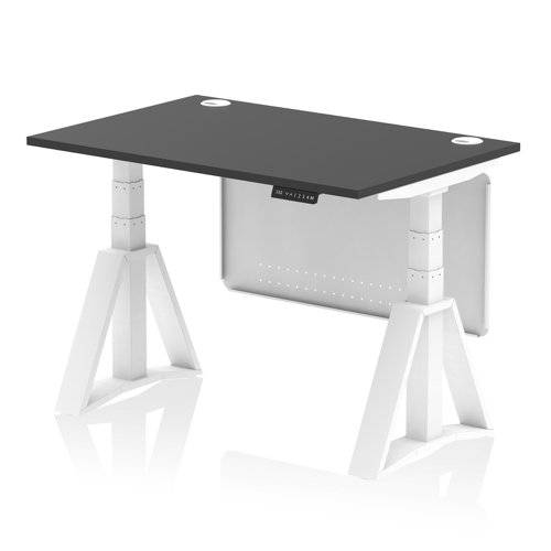 Air Modesty 1200 x 800mm Height Adjustable Office Desk Black Top Cable Ports White Leg With White Steel Modesty Panel with Piste Foot