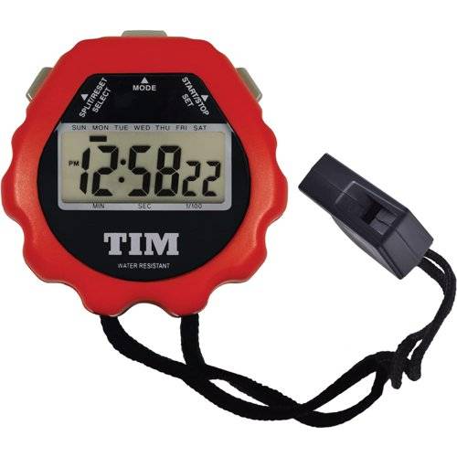 - This Acctim Sprint stopwatch is water resistant, features split timing (1/100th second), alarm, backlight for enhanced visibility, includes a lanyard and whistle. Supplied with CR2032 Coin cell battery.