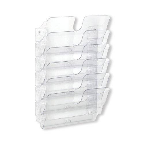 - Showcase and organise A4 landscape literature with the Durable Flexiplus Wall Mounted Literature Tray in clear. This modular system includes 6 strong plastic trays, perfect for presenting brochures, leaflets, and files in a clean, professional way. Each tray mounts easily to flat, load-bearing surfaces and can be expanded with additional units as your storage needs grow, offering a flexible and future-proof solution. The sleek design and high-capacity format make it suitable for offices, schools, showrooms, and reception areas. Designed and manufactured in Germany, all Flexiplus trays are made from premium-quality plastic, undergo strict quality control, and are 100% recyclable in line with ISO 14021 environmental standards.