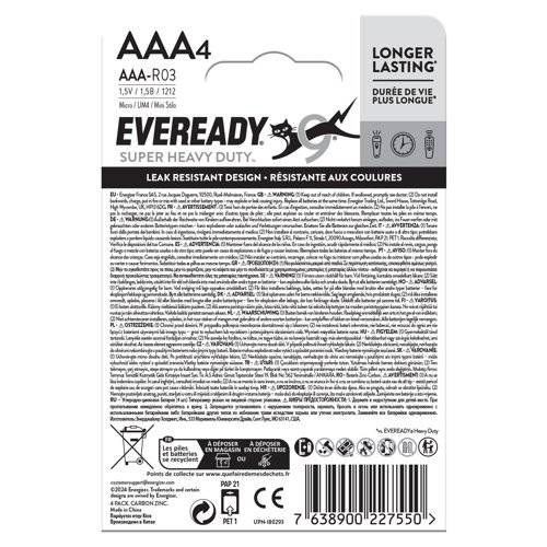 - Eveready batteries allow you to power all of your devices with ease, ensuring that they can last for longer without any poor performance. Made from carbon zinc, these batteries are cadmium and mercury free, ensuring that they are non-toxic and ecologically friendly. The AAA battery allows you to power a range of different devices, including torches, toys, radios and clocks. These reliable batteries are good for up to 3 years after the printed date.