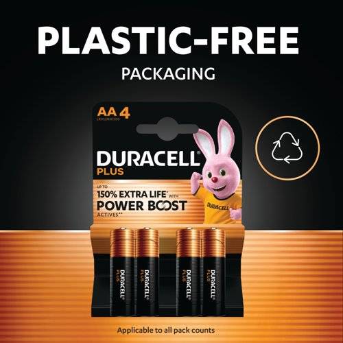 - Duracell Plus AA alkaline batteries are ideal for powering all your everyday devices, providing up to 150% extra life with Duracell's patented POWER BOOST Actives - a unique blend of lithium & nickel which delivers lasting performance in your devices. The superior nylon top closure helps prevent leakage, and the 0% plastic packaging is recyclable. With 10 years in storage guaranteed, you can trust Duracell Plus to deliver reliable power whenever you need it.