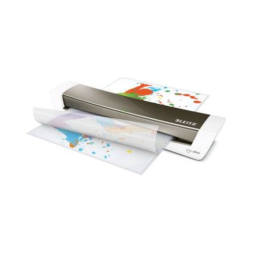This Leitz iLAM A3 laminator is ideal for both home or office use and offers hassle free laminating with excellent results. With no complicated settings and a warm up time of 3 minutes, this iLAM laminator features an LED and sound warning indicator to notify you when the machine is ready, and automatically shuts off if inactive for 30 minutes. With an approximate speed of 60 seconds to laminate a 160 micron A4 pouch, this laminator accepts up to 250 micron thick pouches and includes a free starter pack of pouches.