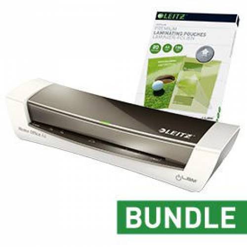 - This Leitz iLAM A4 laminator is ideal for both home or office use and offers hassle free laminating with excellent results. With no complicated settings and a warm up time of 3 minutes, this iLAM laminator features an LED and sound warning indicator to notify you when the machine is ready, and automatically shuts off if inactive for 30 minutes. With an approximate speed of 60 seconds to laminate a 160 micron A4 pouch, this laminator accepts up to 250 micron thick pouches and includes a free starter pack of pouches.