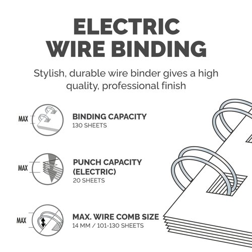 20 sheet punch capacity, 130 sheet binding capacity with a maximum wire size of 14mm