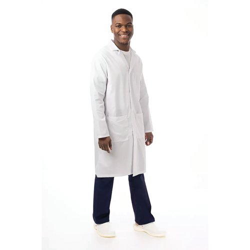 - Professional unisex lab coat designed for medical and healthcare environments. Crafted from lightweight 195gsm polyester-cotton blend, offering durability and comfort. Featuring three practical pockets - one chest and two hip - with convenient concealed stud fastening. Classic white 42-inch length provides full professional coverage, suitable for laboratory, medical, and healthcare professionals seeking reliable and functional workwear.