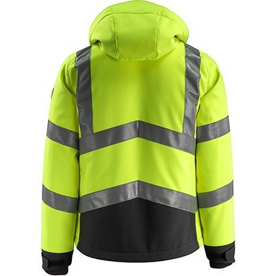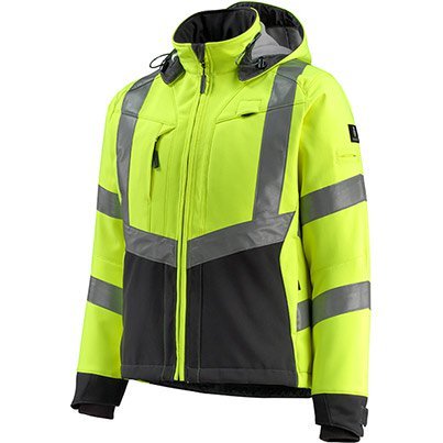 - This super stylish hi-vis softshell jacket contains lots of features to help you look good and stay safe at work. The highly visible colour is accentuated with a chevron design and finished with a contrast colour at the base and cuffs where dirt is most likely to gather, helping you to stay looking sharp after a hard day's work. This MASCOT jacket is highly durable too, with abrasion-resistant CORDURA reinforcements at the wrist and a ripstop fabric to guard against wear and tear. Handy pockets and a detachable hood add practicality to ensure that this hi-vis jacket becomes an integral part of your safety workwear.