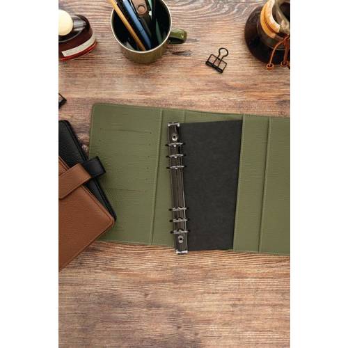 - A gender-neutral organiser created with sustainability and lifestyle organisation in mind. Crafted from vegan grain leather made from 100% post-consumer recycled plastic and featuring 100% recycled, fountain pen friendly paper, this collection offers a stylish yet conscious choice. With the innovative feature of charcoal removable rings, the Camden redefines flexibility and functionality, making it easier than ever to customise any planning experience. Supplied in Olive.