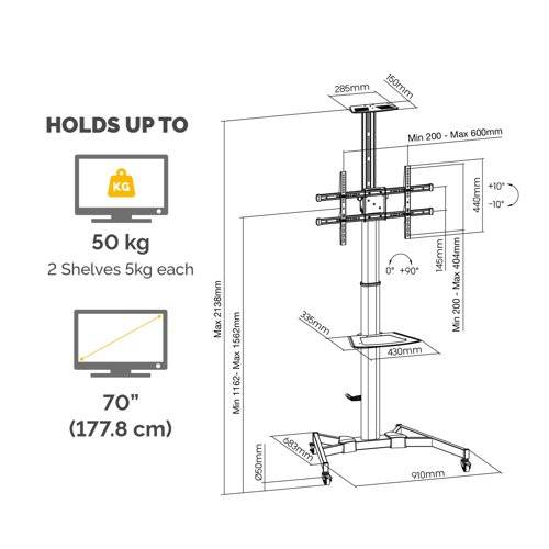 - Designed for dynamic work environments, this portable TV stand is ideal for presentations, video conferencing, and collaborative setups. Its sleek, space-efficient design supports screens up to 70in and 50kg, combining robust stability with modern aesthetics. Mobility is effortless thanks to four heavy-duty casters, each equipped with a locking mechanism to keep the stand securely in place when needed. A smooth crank handle allows for height adjustments across a 40cm range, making it easy to tailor the viewing angle to your space. The stand also offers flexible screen positioning, with support for both portrait and landscape orientations and a 20° tilt to reduce glare and improve visibility. Integrated cable management keeps wires neatly tucked away, while two built-in shelves provide convenient storage for AV components, helping you maintain a clean and organised setup.
