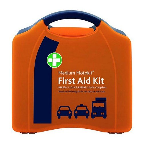 - This Reliance Medical Motokit contains 1 x triangular bandage 1 x adherent dressing pad 1 x HSE medium dressing 1 x medium trauma dressing 2 x burn dressings 10 x washproof plasters 1 x foil blanket 1 x resuscitation face shield 10 x cleansing wipes 1 x pair of gloves 1 x pair of shears and a first aid guidance leaflet. This medium kit is designed for use in cars taxis vans and trucks with up to 8 passengers.